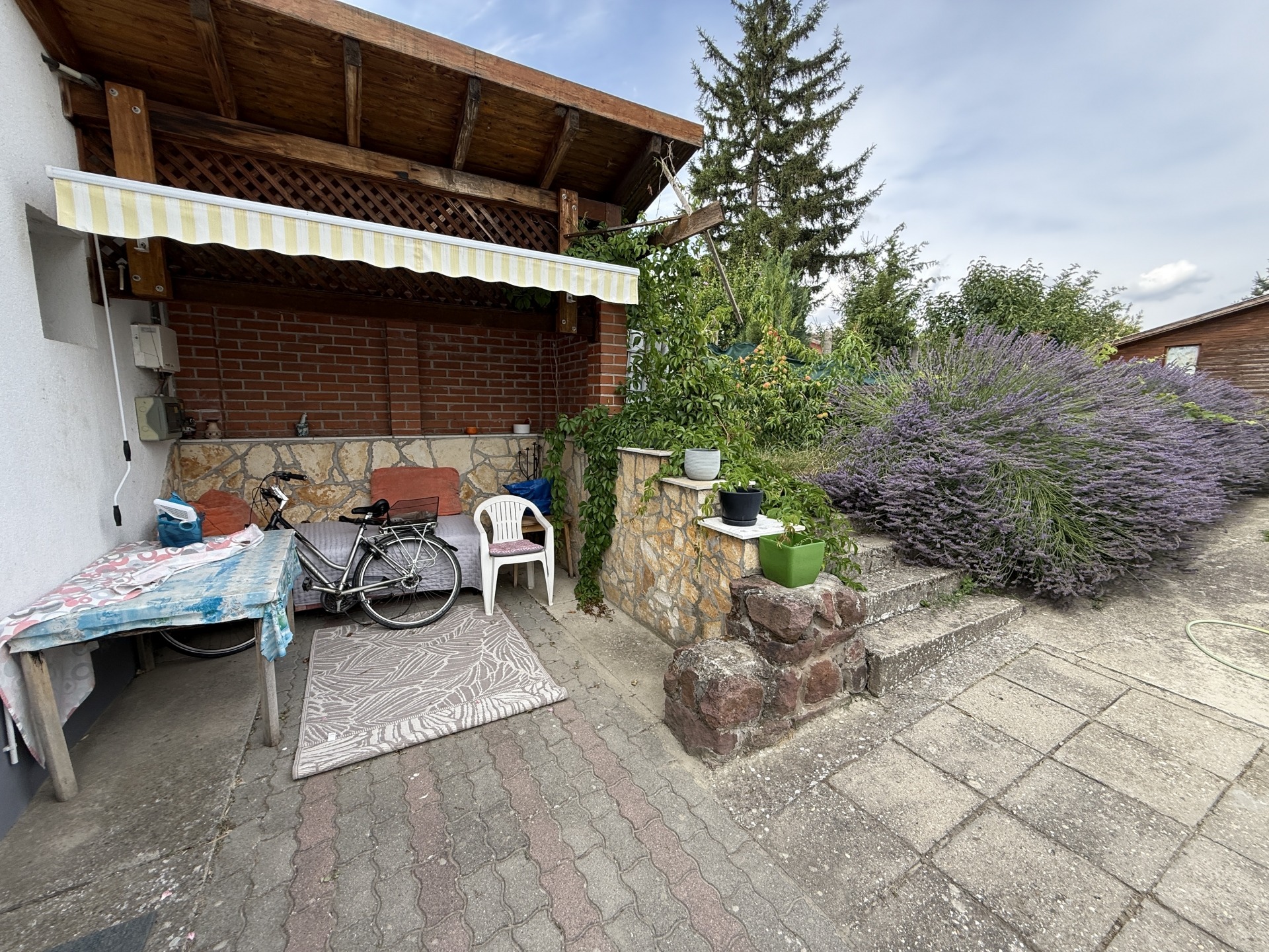 Az udvar minden szempontból jól átgondolt: térkövezett, rendezett, akár autó számára is biztosít parkolást. Egy 25 m²-es, fedett kiülő teremt kellemes, árnyékos pihenőhelyet, emellett fa tároló gondoskodik a kerti szerszámok és kerékpárok elhelyezéséről, valamint a ház alatt egy 12 m2-es pince is megtalálható.