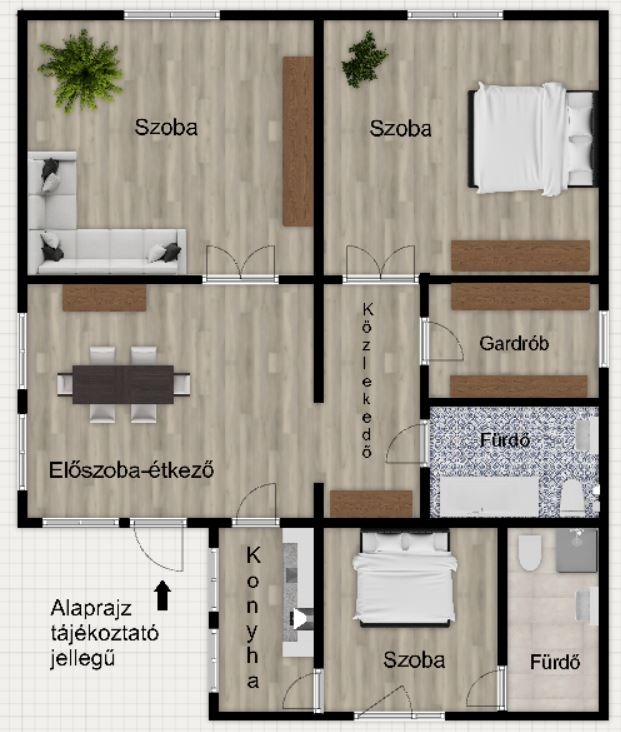 A nagyobb 90 m2-es házban három szoba (hűtő-fűtő klímával felszerelt) , előszoba-étkező, konyha, közlekedő és gardrób helyiség került kialaításra. Két fürdőszoba szolgálja a lakók kényelmét – az egyik zuhanyzós, a másik kádas –mindkettő felújított. Minden helyiség modern burkolatot kapott.