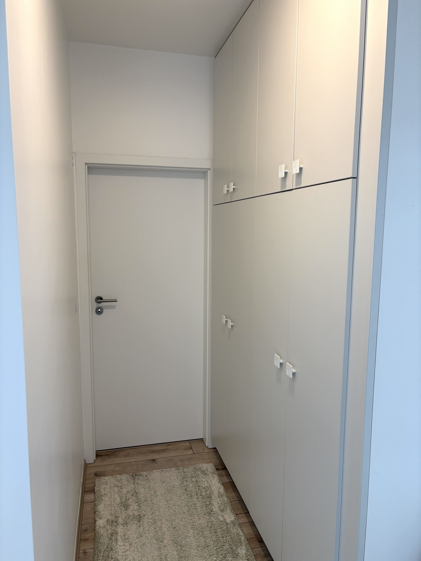 Az egyedi, beépített bútorok letisztult megjelenést kölcsönöznek minden helyiségnek.
